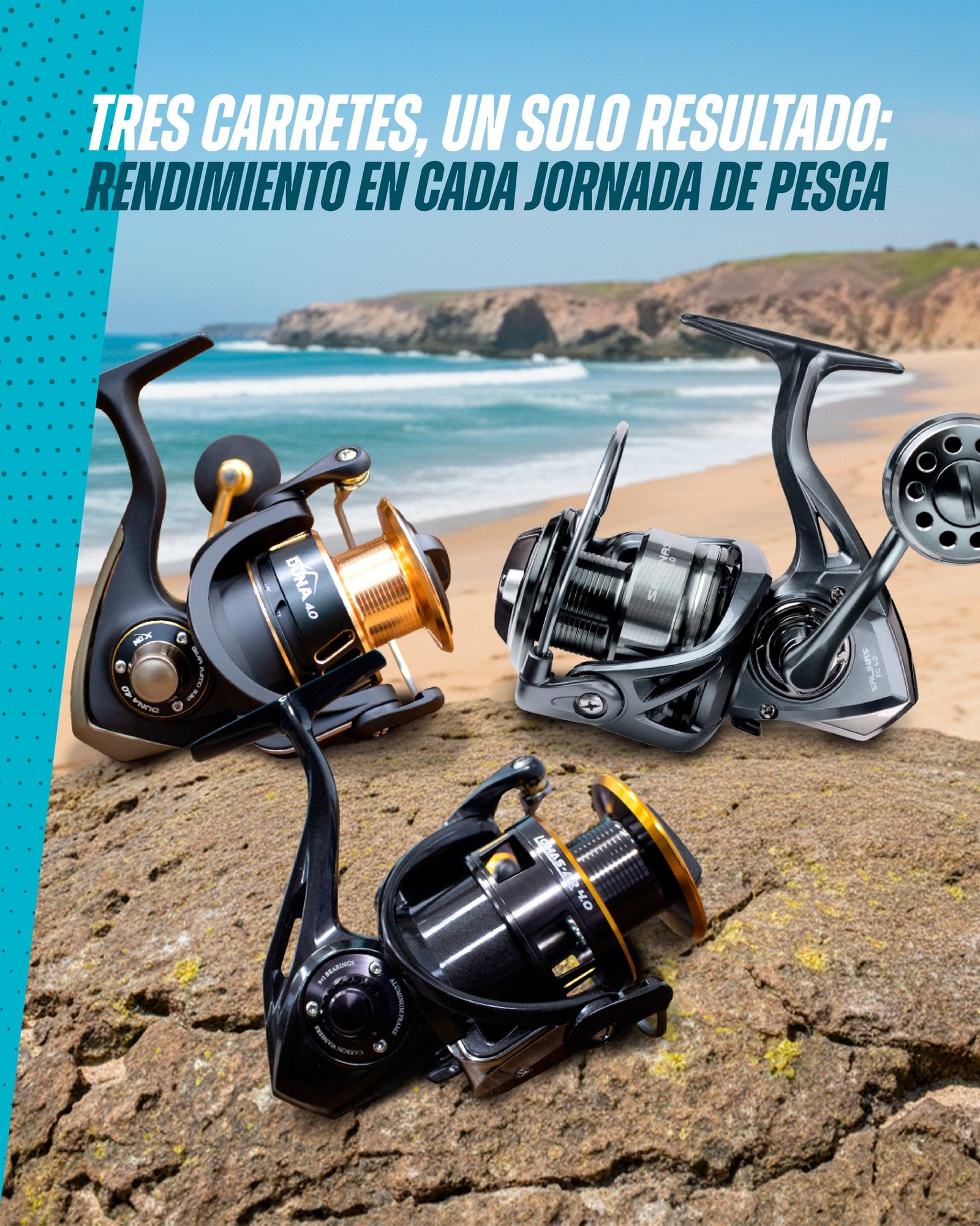 Carrete compacto de Spinning, especialmente diseñado para la pesca en agua salada, fuerte, veloz, aconsejable para la pesca de Corvina, Lenguado, Robalo y cualquier otro predador de nuestros mares.