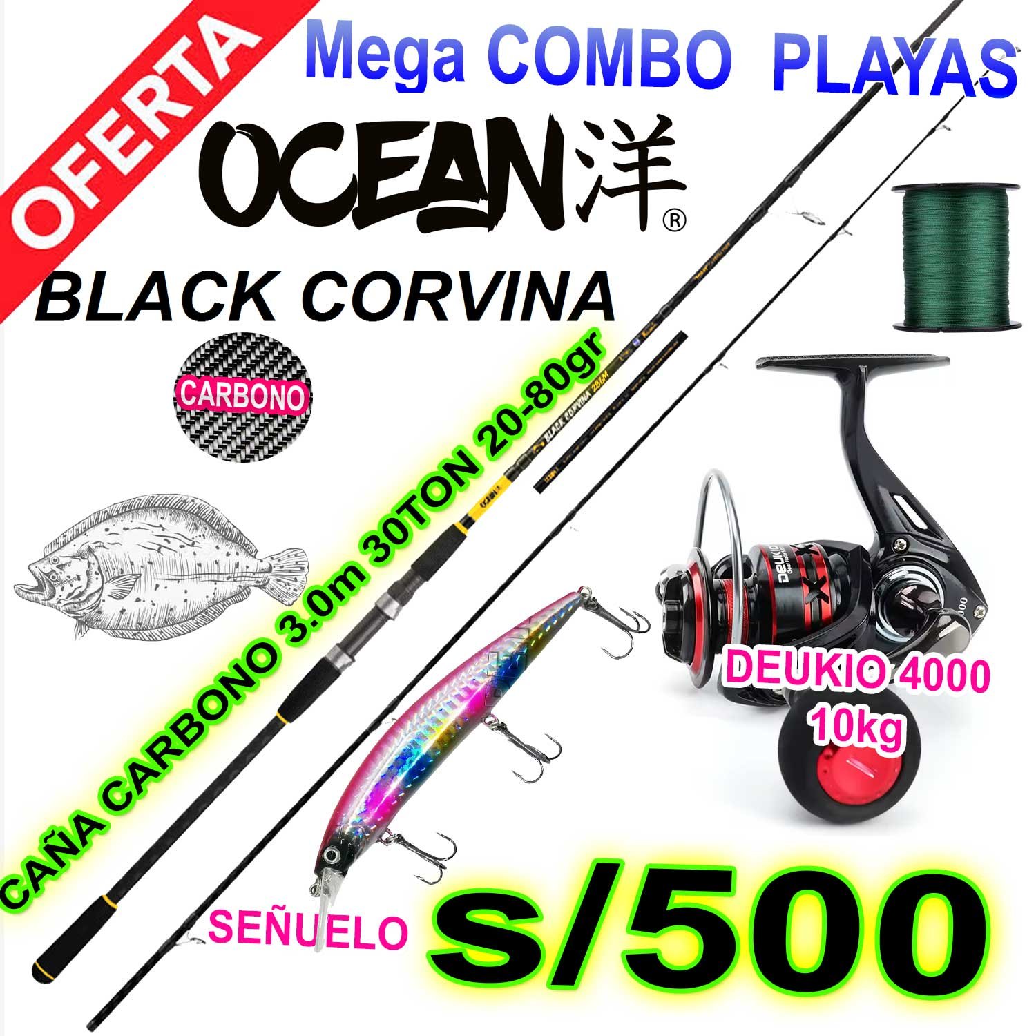 COMBO CAÑA BLACK CORVINA OCEAN 3.0m + CARRETE DEUKIO 4000 10kg Con accesorios