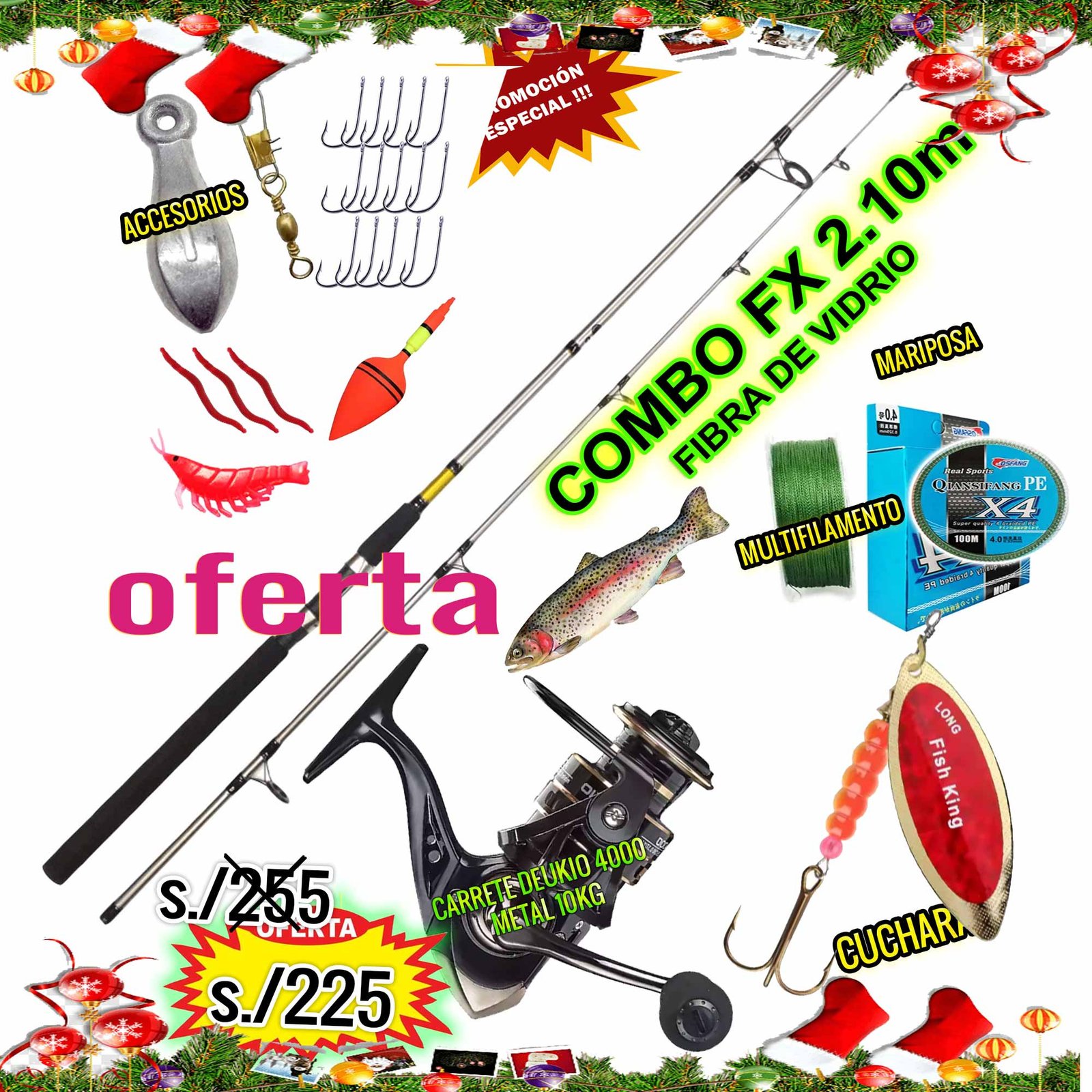 Combo caña de pescar Caña shimano 2.10m para truchas lagunas ríos Deukio 4000