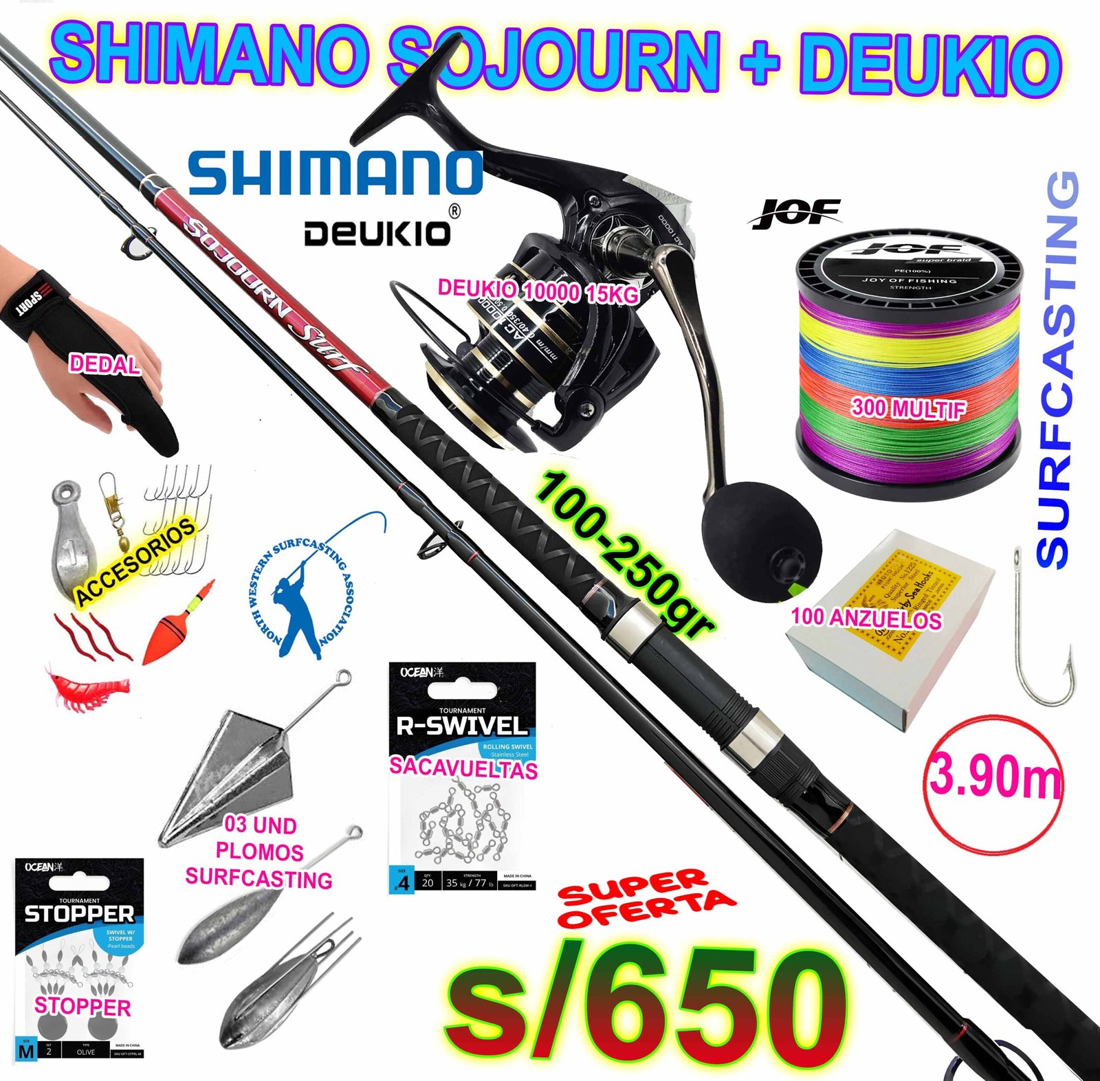 COMBO CAÑA DE PESCAR SURFCASTING SHIMANO SOJOURN 3.90m CARBONO + DEUKIO 10000 15KG CON ACCESORIOS