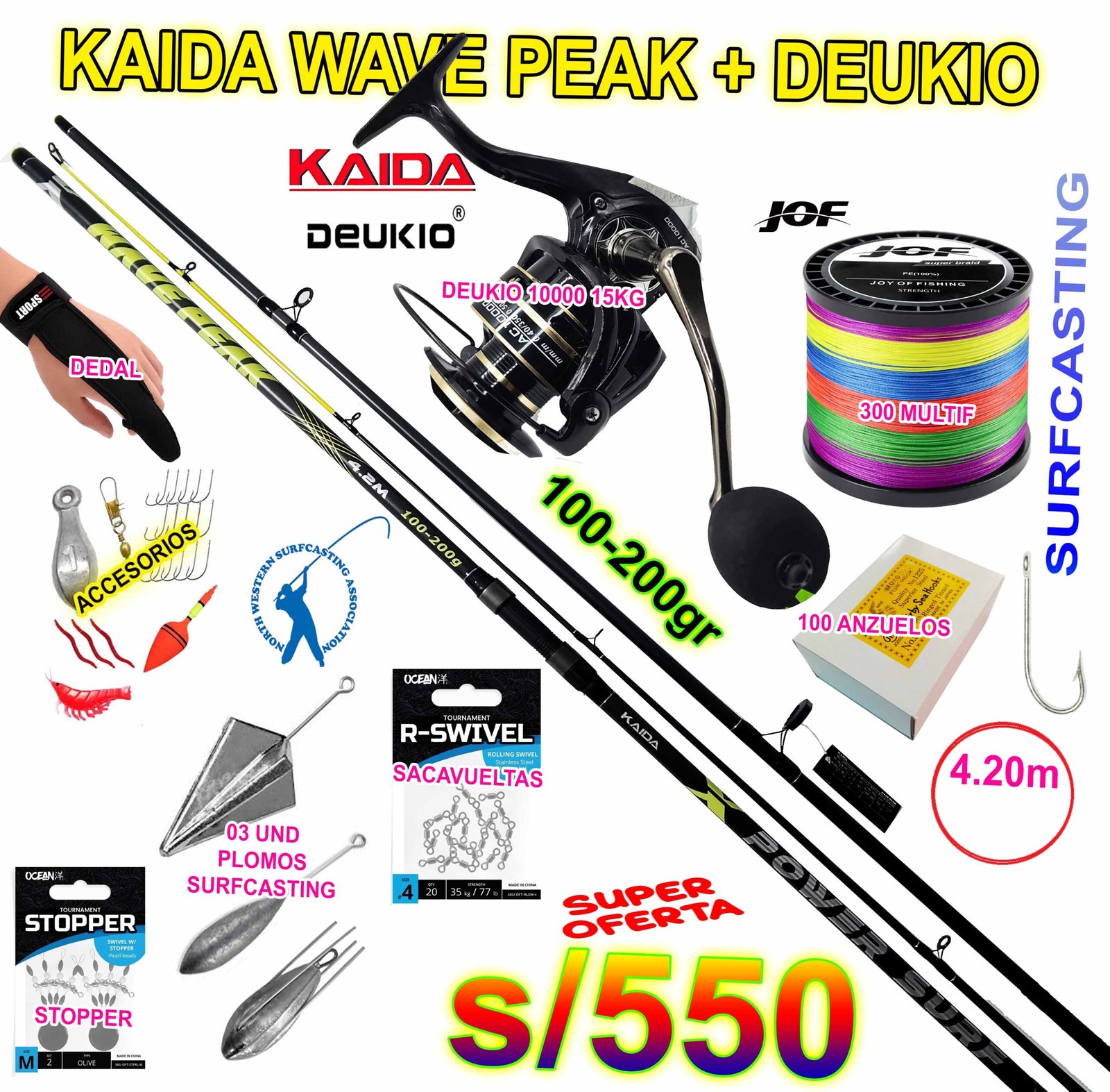 COMBO CAÑA DE PESCAR SURFCASTING WAVE PEAK 4.20M CARBONO + DEUKIO 10000 15KG CON ACCESORIOS