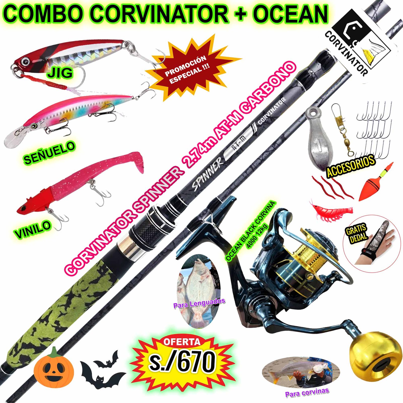 MegaCombo Caña de pescar Ocean® Corvina 4000 + CORVINATOR® SPINNER 2.74m Carbono Vinilo Señuelo Jig Acceorios