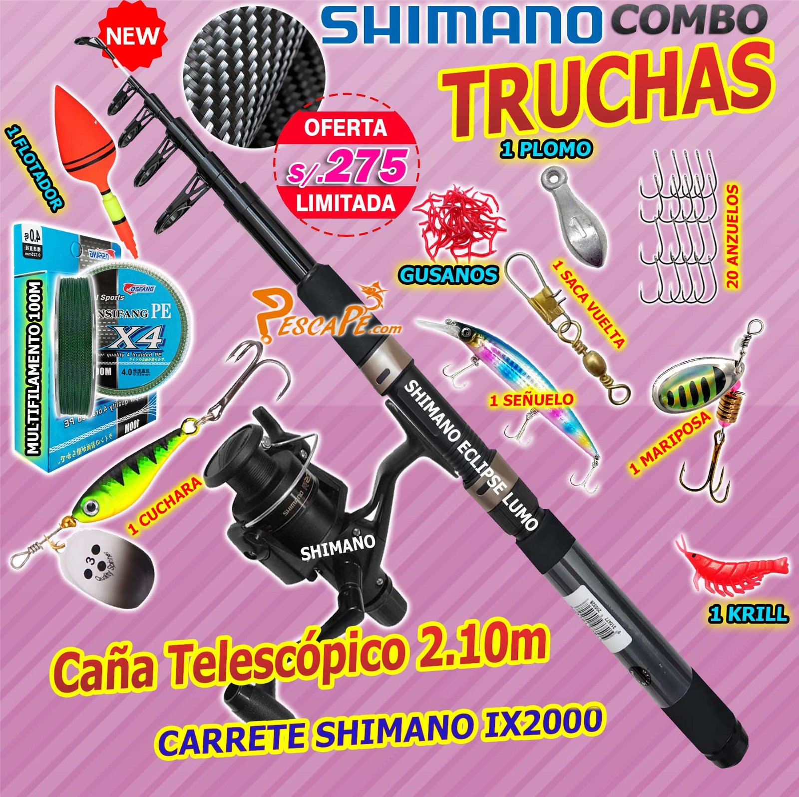 MegaCombo Caña de Pescar SHIMANO® ECLIPSE LUMO 2.10m Telescópico Carrete IX2000 Accesorios